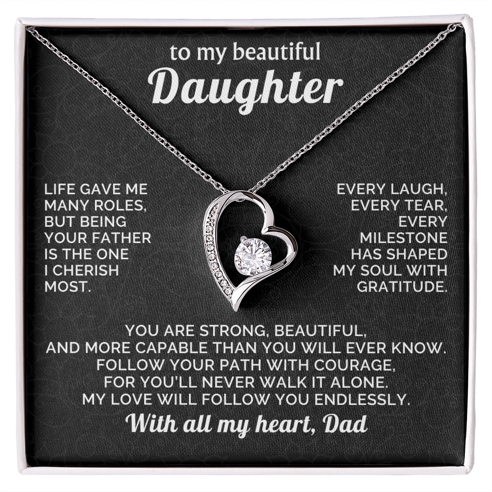 This elegant Forever Love Necklace features a dazzling heart-shaped pendant and a touching message card that reads, “Life gave me many roles, but being your father is the one I cherish most.”